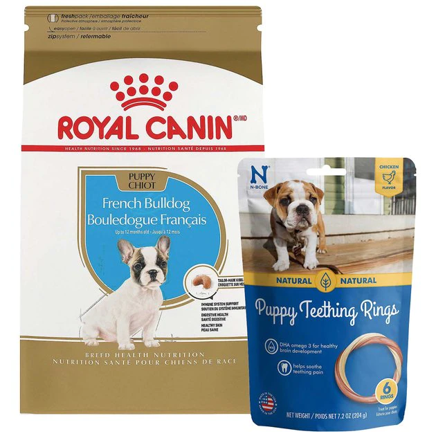 Satisfy your furry young friendโs hunger with Royal Canin French Bulldog Puppy Dry Food + N-Bone Puppy Teething Ring Chicken Flavor Dog Treats. Designed specifically for purebred French Bulldogs under 12 months of age, the tailor-made nutrition of Royal Canin French Bulldog Puppy Dry Dog Food gives your newest four-legged family member everything that she needs to thrive. Plus, the N-Bone Puppy Teething Ring is designed specifically for the chewing needs of puppies with added calcium to support healthy bones and teeth. This bundle will allow you to worry less and enjoy your adorable new furry friend more!