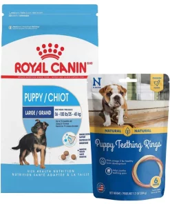 Show your big oleโ buddy how to live the best life! Each purchase comes with Royal Canin Large Puppy Dry Dog Food, 35-lb bag & N-Bone Puppy Teething Ring Chicken Flavor Dog Treats, 6 count. Royal Canin Large Puppy Dry Dog Food addresses the needs of the large dog throughout its lifetime – from the large dogโs longer growth period, to nutrients to help limit inflammation of the joints and highly digestible proteins to ease digestion. N-Bone Puppy Teething Ring Chicken Flavor Dog Treats satisfy your furry young friendโs natural need to gnaw and help soothe his sore gums. With a round shape thatโs designed specifically for the chewing needs of puppies, added calcium to support healthy bones and teeth, and the delectably savory taste of chicken that your newest furry family member will find irresistible, youโll both love these teething chews. And thanks to the pliable and digestible formula of N-Bone Puppy Teething Rings, you donโt have to worry about your young pooch damaging his immature teeth or eating something that heโs not supposed, unlike traditional puppy chew bones that are made from rubber or plastic.