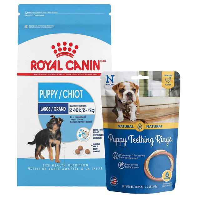 - Each purchase comes with Royal Canin Large Puppy Dry Dog Food, 35-lb bag & N-Bone Puppy Teething Ring Chicken Flavor Dog Treats, 6 count.