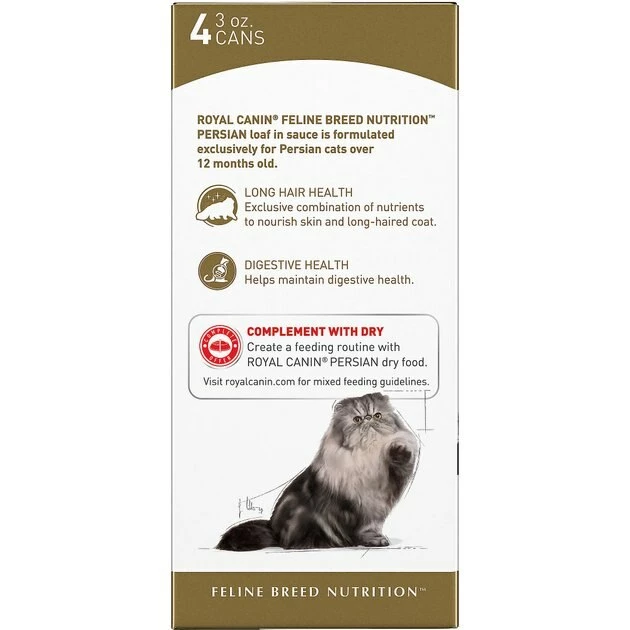 Royal Canin Persian Loaf in Sauce Wet Cat Food is tailor-made nutrition created just for your Persian pure breed. A combination of essential nutrients, including amino acids, vitamins, and omega-6 and omega-3 fatty acids, promotes healthy skin and a healthy coat, keeping your Persian’s long, luxurious coat shiny and soft. This complete and balanced soft cat food promotes healthy digestion. Is your Persian cat a picky eater? This wet food can be fed alone or complemented with Royal Canin Persian Dry Cat Food for a meal that’s sure to please even the finickiest of cats.