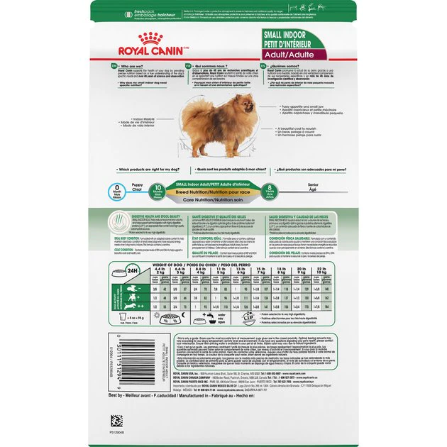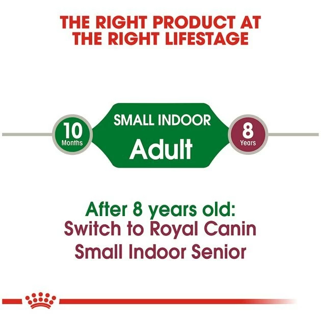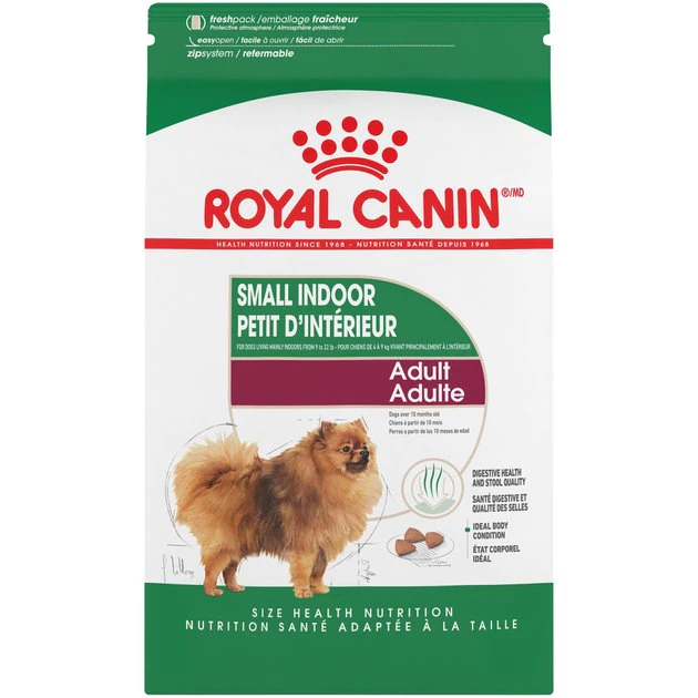 Royal Canin Small Indoor Adult Dry Dog Food is tailored to support your small dog breedโs quiet lifestyle. Itโs formulated with just the right amount of calories to give him the energy he needs to help maintain a healthy weight and optimal body condition. Precise levels of fatty acids, like EPA and DHA, support healthy skin and a beautiful, shiny coat. Highly digestible proteins decrease the amount of dog stool odor and its less-than-desirable smell. Mix with your dogโs favorite wet food to add variety to his bowl.