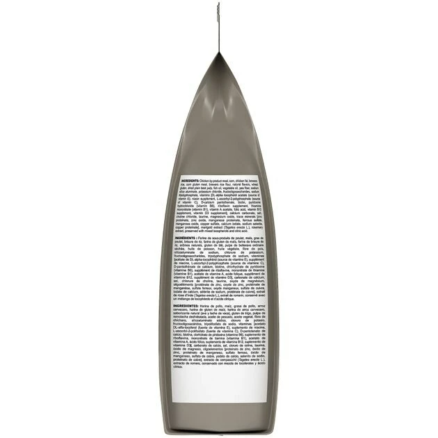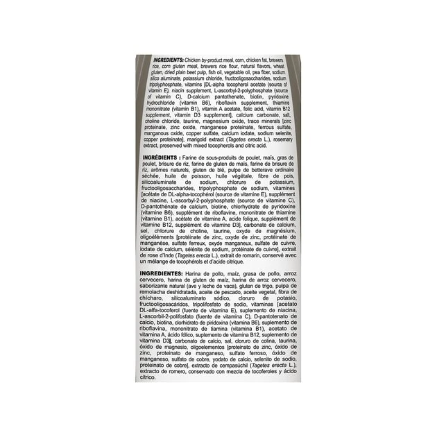 Chicken By-Product Meal, Corn, Chicken Fat, Brewers Rice, Corn Gluten Meal, Brewers Rice Flour, Natural Flavors, Wheat Gluten, Dried Plain Beet Pulp, Fish Oil, Vegetable Oil, Pea Fiber, Sodium Silico Aluminate, Potassium Chloride, Fructooligosaccharides, Sodium Tripolyphosphate, Vitamins [Dl-Alpha Tocopherol Acetate (Source Of Vitamin E), Niacin Supplement, L-Ascorbyl-2-Polyphosphate (Source Of Vitamin C), D-Calcium Pantothenate, Biotin, Pyridoxine Hydrochloride (Vitamin B6), Riboflavin Supplement, Thiamine Mononitrate (Vitamin B1), Vitamin A Acetate, Folic Acid, Vitamin B12 Supplement, Vitamin D3 Supplement], Calcium Carbonate, Salt, Choline Chloride, Taurine, Magnesium Oxide, Trace Minerals [Zinc Proteinate, Zinc Oxide, Manganese Proteinate, Ferrous Sulfate, Manganous Oxide, Copper Sulfate, Calcium Iodate, Sodium Selenite, Copper Proteinate], Marigold Extract (Tagetes Erecta L.), Rosemary Extract, Preserved With Mixed Tocopherols And Citric Acid.