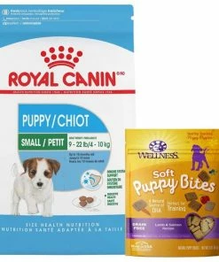 Royal Canin Small Puppy Dry Food + Wellness Soft Puppy Bites Lamb & Salmon Recipe Grain-Free Dog Treats are the perfect duo to give to your growing buddy! The dry dog food is created especially for puppies up to 10 months between 9 and 22 lbs. The kibble helps support the puppyโs natural defenses with an antioxidant complex and mannanoligosaccharides and helps maintain healthy skeletal development with an adapted calcium and phosphorus content. Once theyโre done with their meal, treat them with the perfectly delicious and nutritious Wellness Soft Puppy Bites. A natural source of DHA and omega 3, they are also made without any meat by-products, corn, wheat or dairy, and artificial colors or flavors. These treats are a great mixture of pure meat protein with added fruits and veggies to give your growing dog the nutrients they need to be healthy and strong!